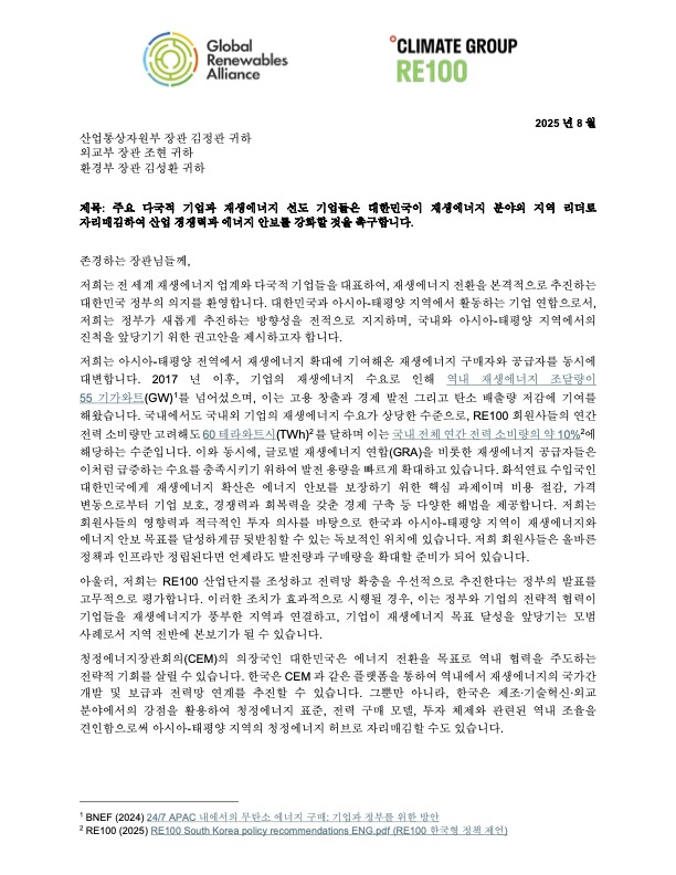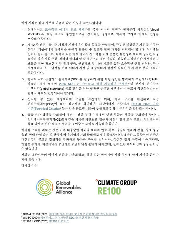 다음은 서한 전달에 대한 RE100의 보도자료와 서한 한글번역본 파일이다.